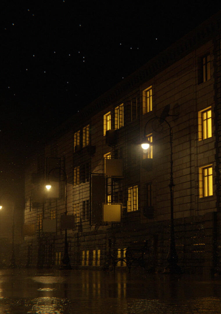 The rhythmic patter of droplets creates a soothing symphony, while reflections dance in puddles, inviting you to wander through this atmospheric urban landscape. Experience the charm and mystery of a town alive in the rain..